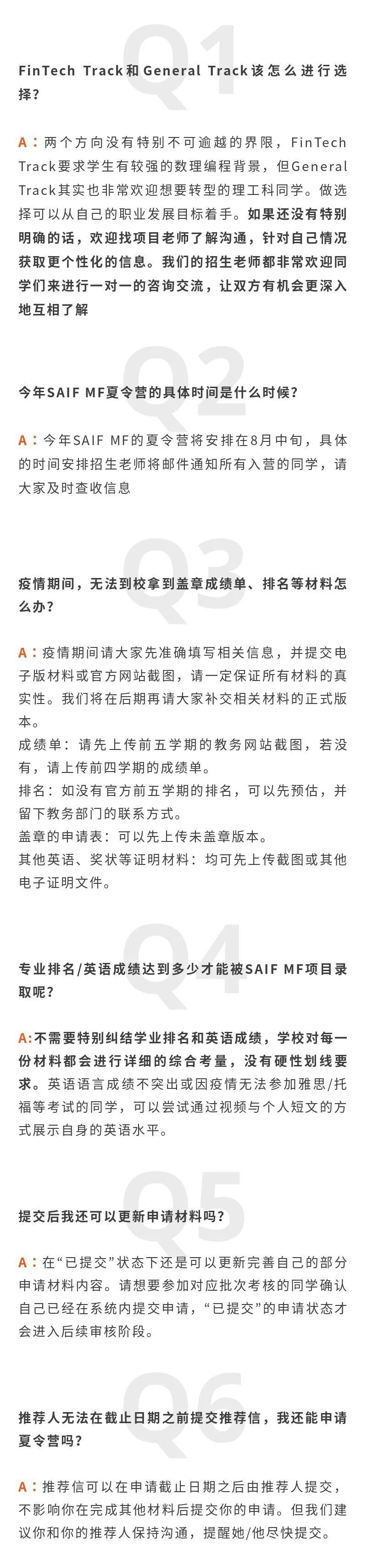 为了在这个特殊的申请季保证所有同学的安全并保障考核的公平性,SAIF MF2021级推免招生夏令营定于2020年8月中旬以线上形式开展。夏令营为2021级推免招生最后批次,请同学们抓紧时间在系统内完成网申并提交材料。